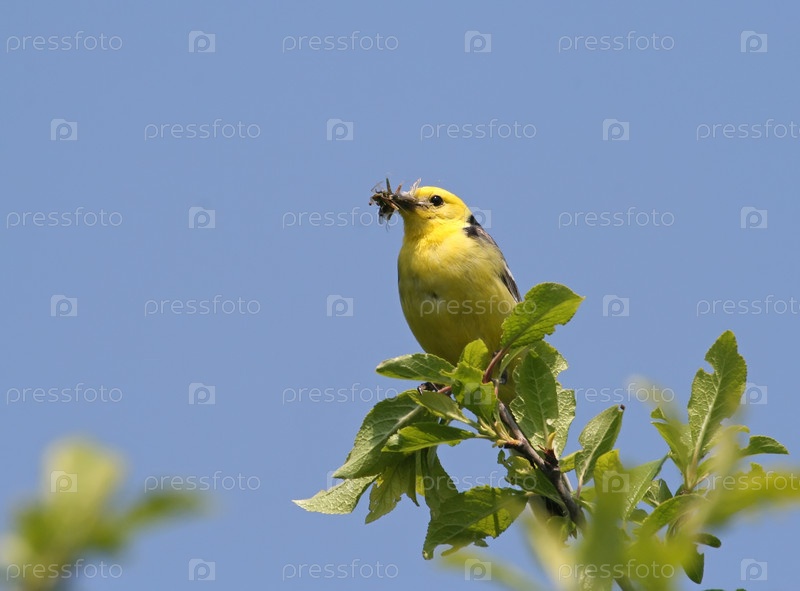 Желтоголовая трясогузка с пищей в клюве