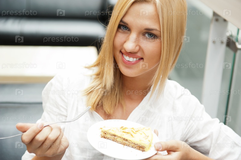 Девушка ест торт в кафе