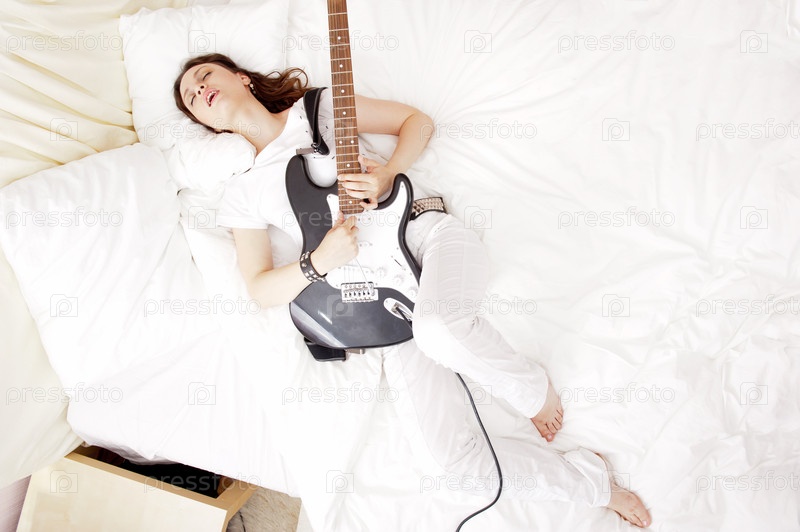Девушка играет на гитаре и поет, лежа на кровати