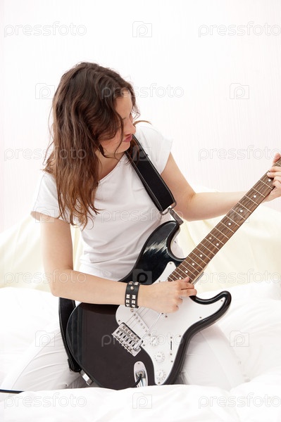 Девушка играет на электрогитаре в своей комнате