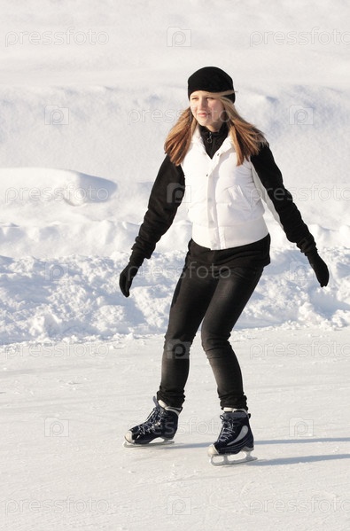 Девушка скользит на зимних коньках на катке