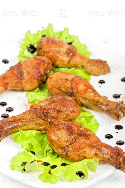 Голень куриная крупным планом на белой тарелке с салатом