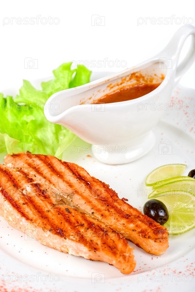 Стейк из лосося с соусом, зеленью, лимоном и оливкам
