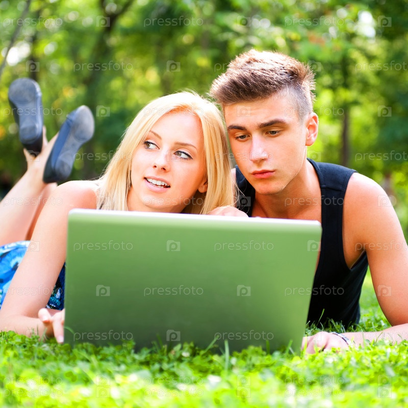 Портрет молодой пары с ноутбуком на траве