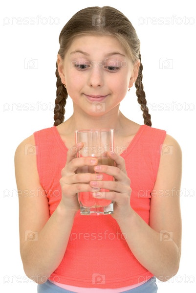 Девушка со стаканом воды на белом фоне