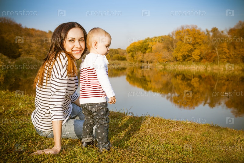 Мать и ребенок на Осеннее озеро