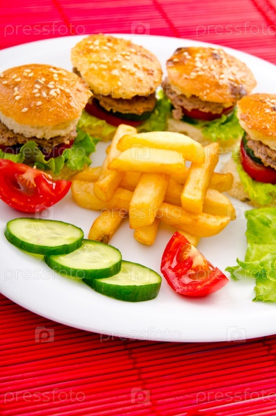 Тарелка с мини-гамбургерами, картофелем фри и овощами
