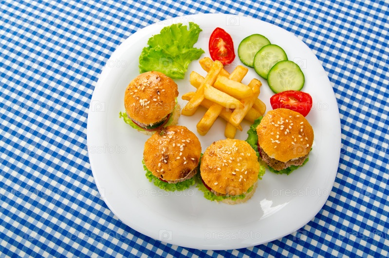 Тарелка с мини-гамбургерами, картофелем фри и овощами