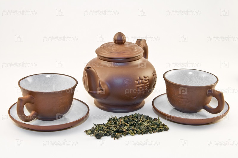Китайские керамические чашки и чайник и горсть зеленого чая на белом фоне