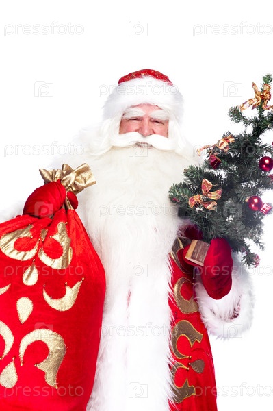 Дед Мороз с новогодней елкой и мешком с подарками на белом фоне