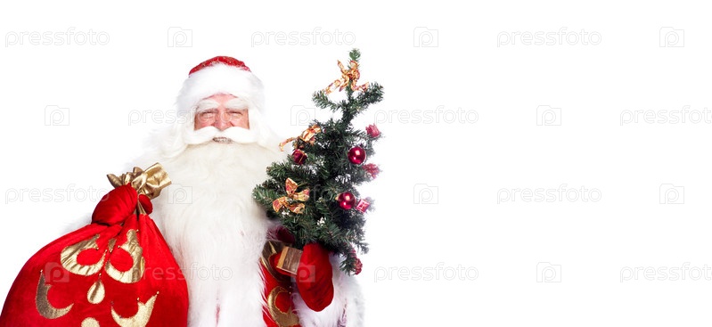 Дед Мороз с новогодней елкой и мешком с подарками на белом фоне