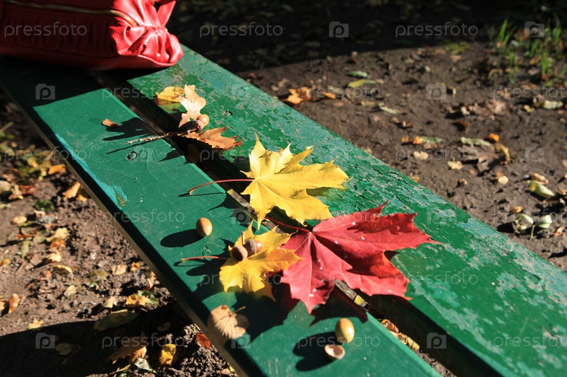 Желтые и красные кленовые листья на зеленой скамейке