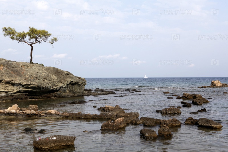 Дерево на скалистом морском берегу