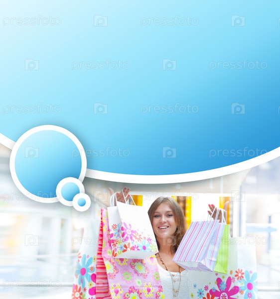 Молодая счастливая женщина с пакетами в торговом центре и шаблон для текста