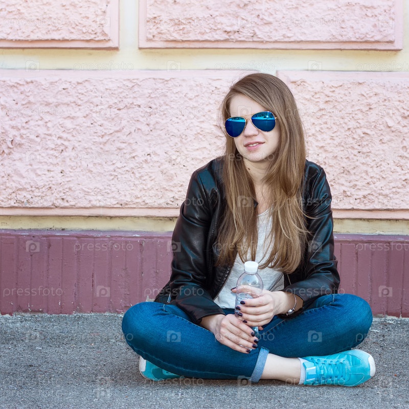 Девушка в куртке, джинсах и солнцезащитных очках, сидя на асфальте