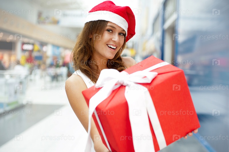 Молодая женщина в колпаке Санта-Клауса с подарочной коробкой в руках в торговом центре