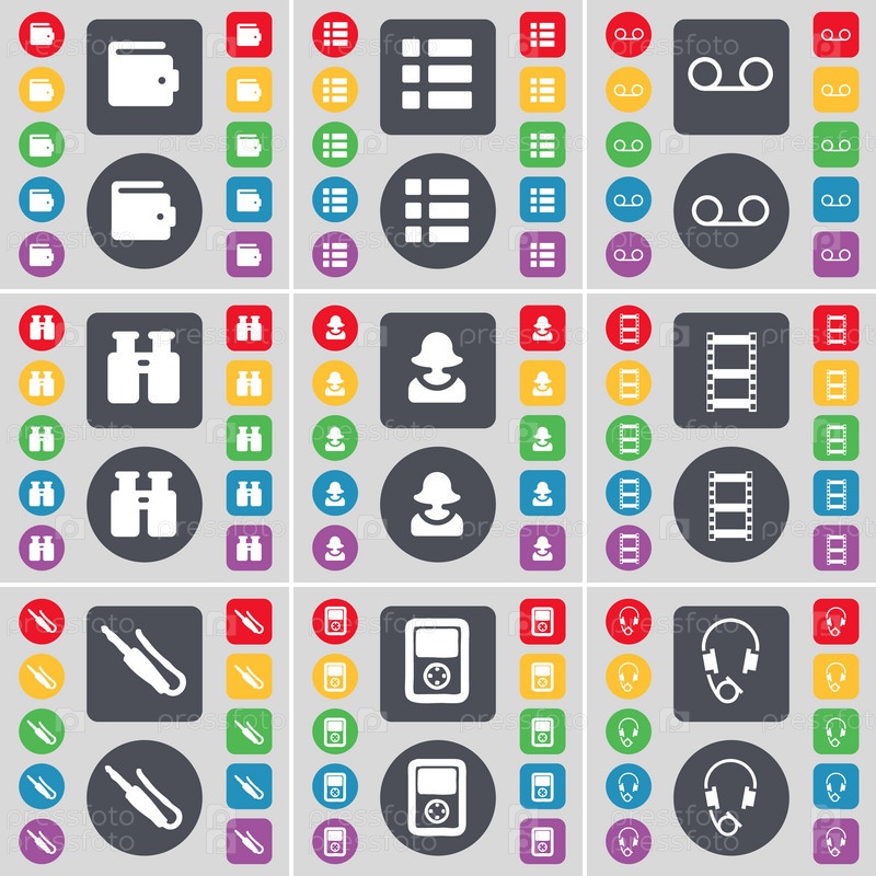 Бумажник, список, кассеты, бинокль, аватар, негативных пленок, разъем для микрофона, игрок, символ значок наушников. Большой набор плоских, цветные кнопки для вашего дизайна. Вектор