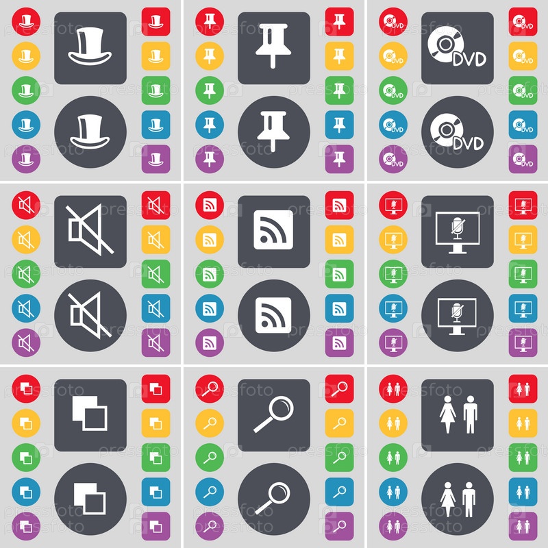 Цилиндр, пин, dvd, молчание, rss, монитор, копирование, увеличитель, силуэт значка символа. большой набор плоских цветных кнопок для вашего дизайна. вектор