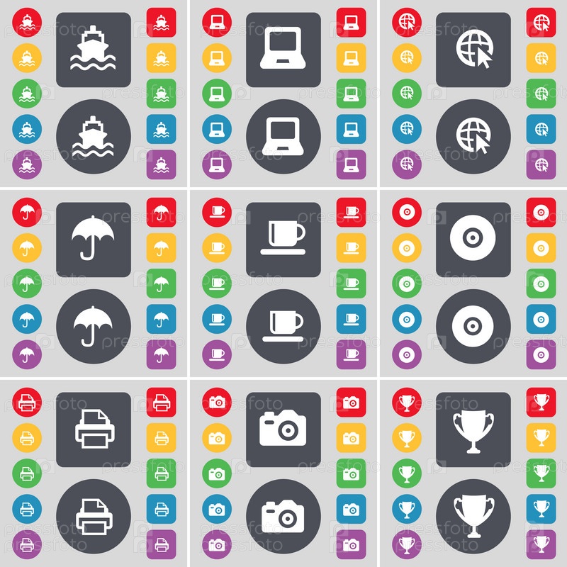 Корабль, ноутбук, веб-курсор, зонтики, чашки, диск, принтер, камера значок символа. большой набор плоских цветных кнопок для вашего дизайна. вектор