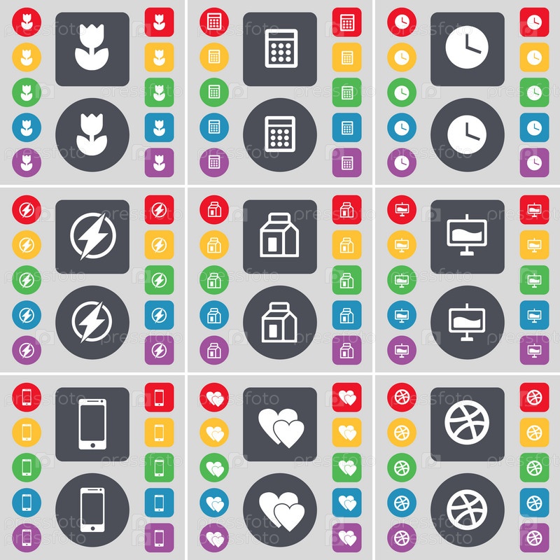 Цветок, калькулятор, будильник, Флэш, упаковка, граф, смартфон, сердце, иконка символа мяча. большой набор плоских цветных кнопок для вашего дизайна. вектор