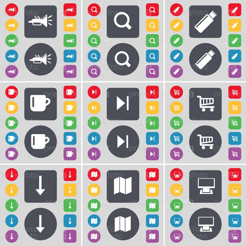 Отменить, увеличитель, USB, Кубок, СМИ пропустите, корзина, стрелка, карта, монитор значок символа. большой набор плоских цветных кнопок для вашего дизайна. вектор