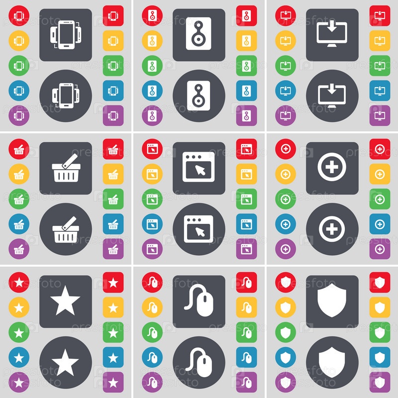 Смартфон, спикер, монитор, корзина, окна, плюс, звезда, мыши, значок значок символа. Большой набор плоских, цветные кнопки для вашего дизайна. Вектор