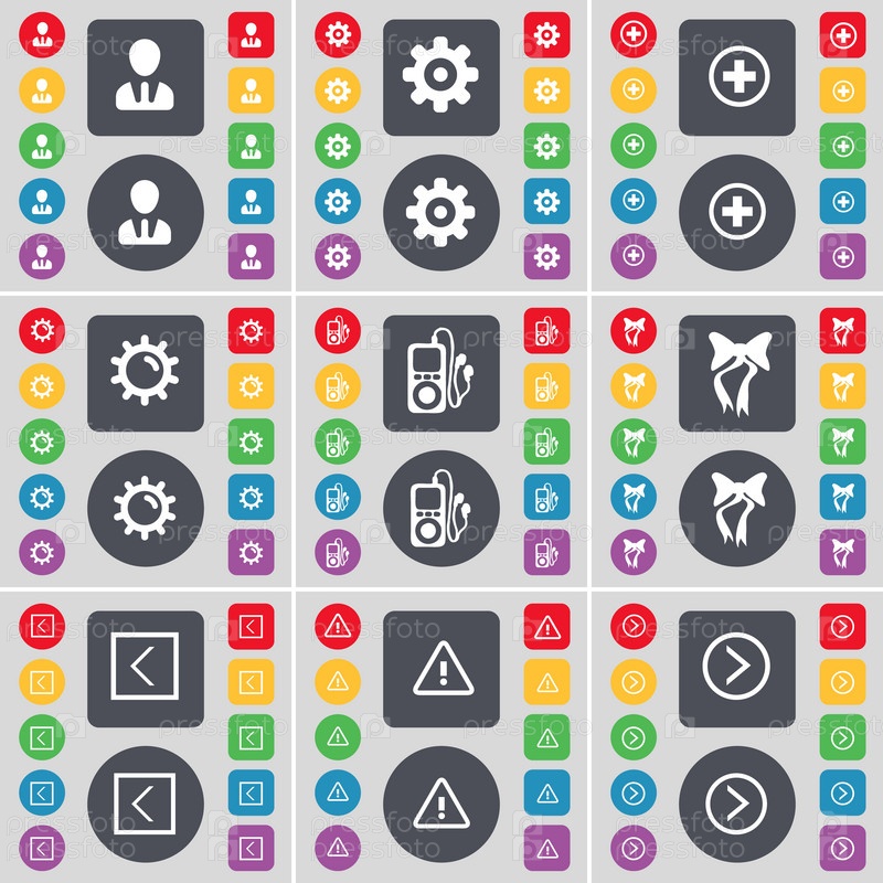 Аватар, Гир, плюс, Гир, MP3-плеер, лук, стрелка влево, предупреждение, справа Икона Стрелки. Большой набор плоских цветных кнопок для вашего дизайна. Вектор