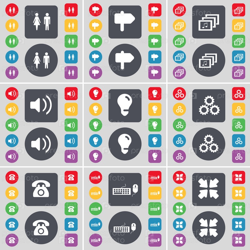 Силуэт, указатель, галерея, звук, лампочки, шестерни, ретро телефон, клавиатуру и мышь, развертывание экран значок символа. Большой набор плоских, цветные кнопки для вашего дизайна. Вектор