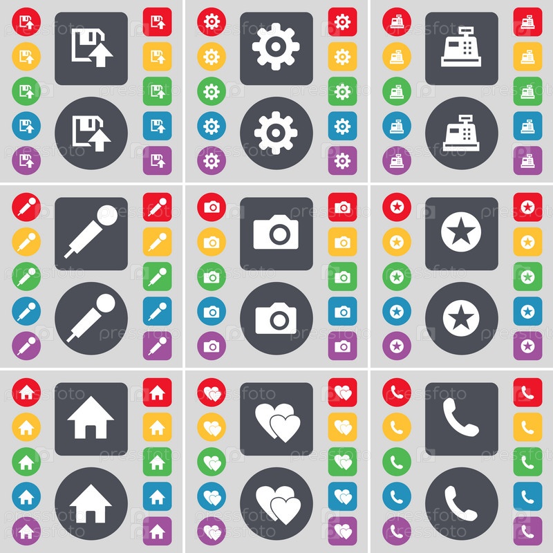 Флопи, Гир, кассовый аппарат, микрофон, камера, звезда, дом, сердце, приемник значок символа. большой набор плоских цветных кнопок для вашего дизайна. вектор