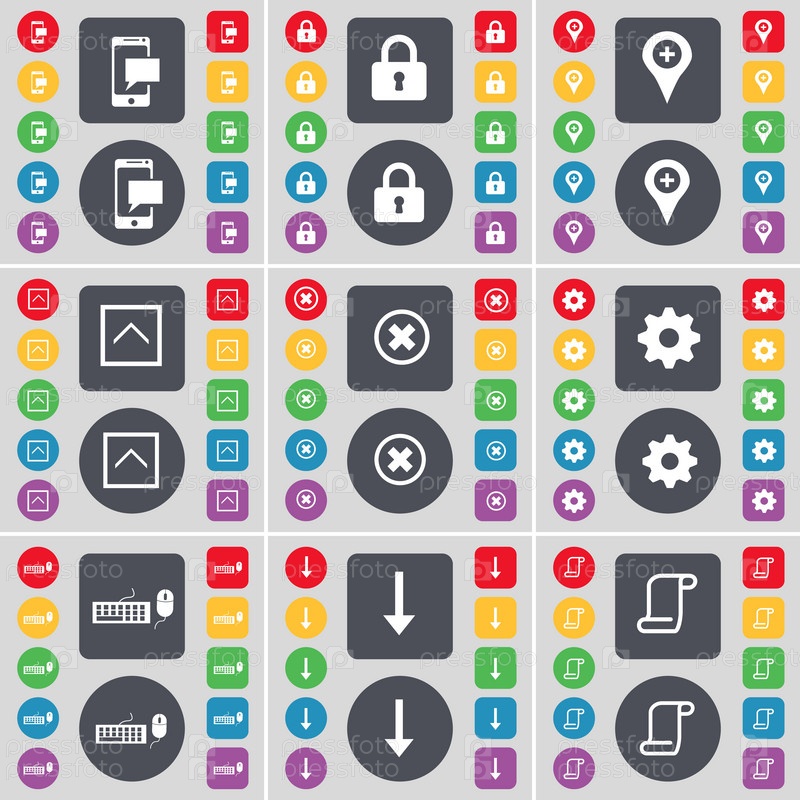 SMS, замок, контрольно-пропускной пункт, стрелка вверх, стоп, Гир, клавиатура, стрелка вниз, выделить значок символа. Большой набор плоских цветных кнопок для вашего дизайна. вектор
