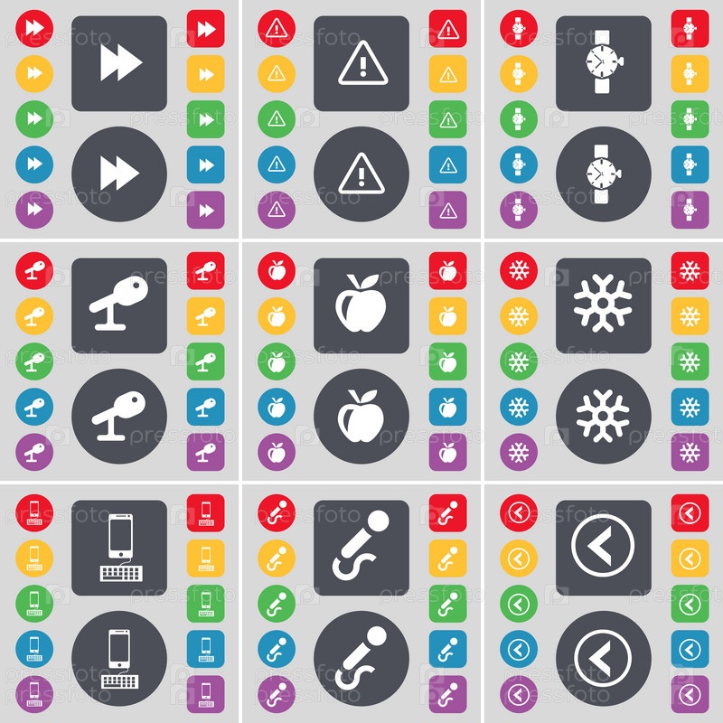 Перемотка назад, предупреждение, наручные часы, микрофон, яблоко, снежинка, смартфон, символ левый значок стрелки. Большой набор плоских, цветные кнопки для вашего дизайна. Вектор