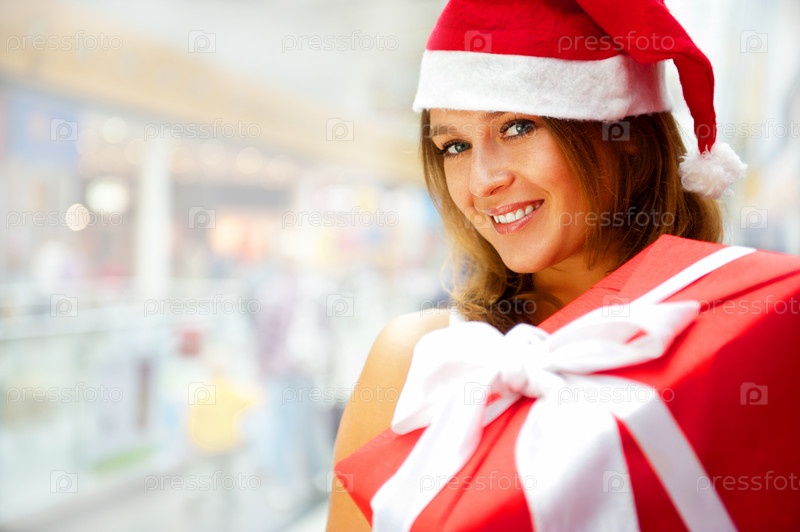 Молодая женщина в колпаке Санта-Клауса с подарочной коробкой в руках в торговом центре