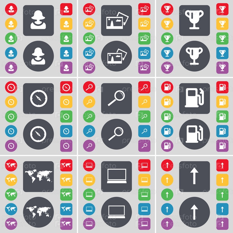 Аватар, фотография, Кубок, компас, увеличительное стекло, автозаправочной станции, глобус, ноутбук, стрелка вверх значок символ. Большой набор плоских, цветные кнопки для вашего дизайна. Вектор