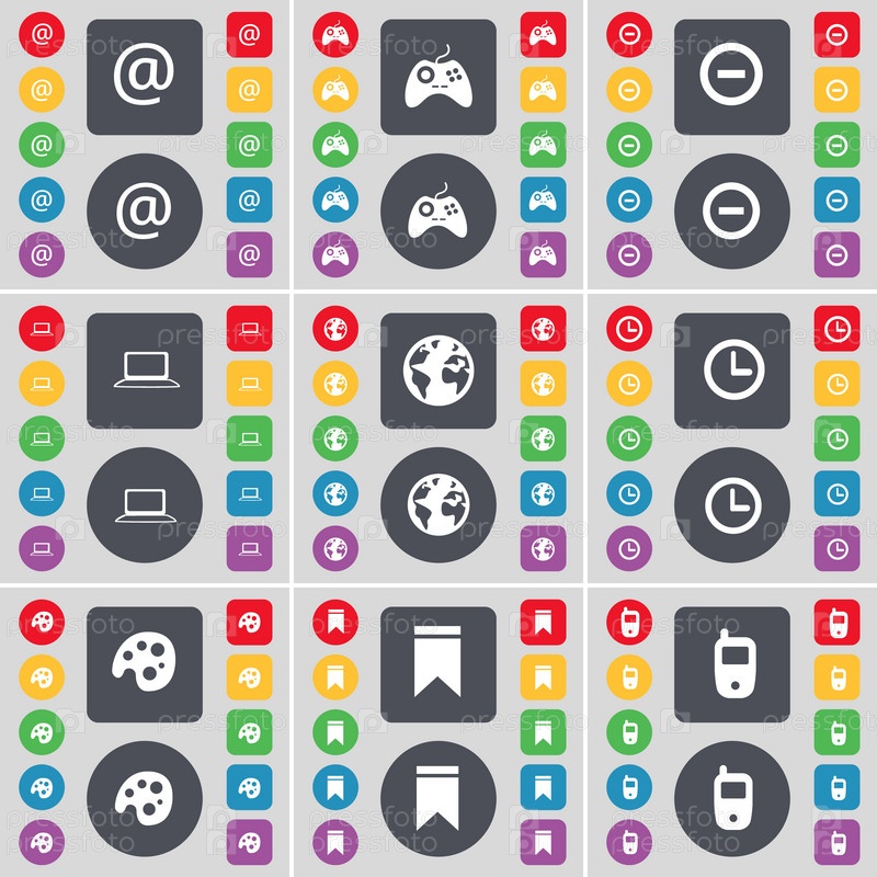 Почта, геймпад, минус, ноутбук, земля, часы, палитра, маркер, символ значок мобильного телефона. Большой набор плоских, цветные кнопки для вашего дизайна. Вектор