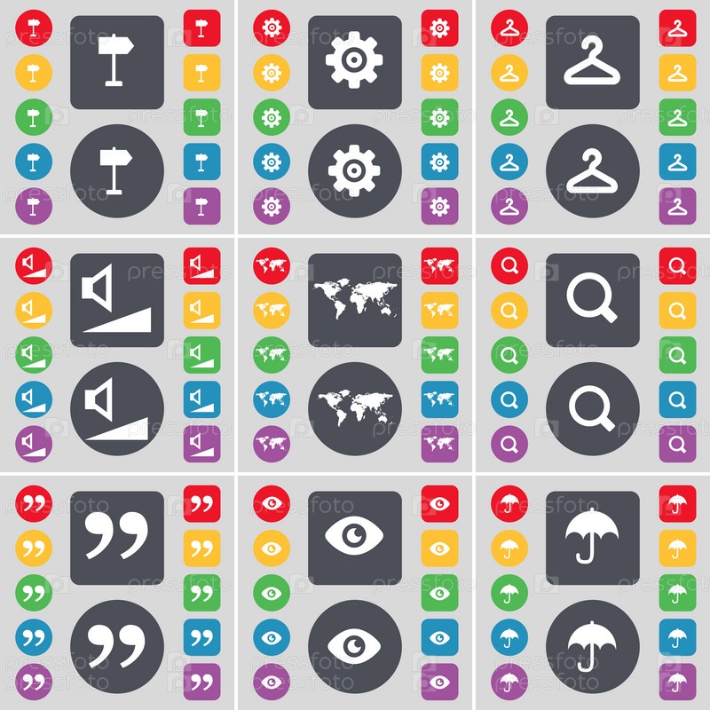 Указатель, снаряжение, вешалка, объем, глобус, увеличительное стекло, цитируя значок символ знака, видение, зонты. Большой набор плоских, цветные кнопки для вашего дизайна. Вектор