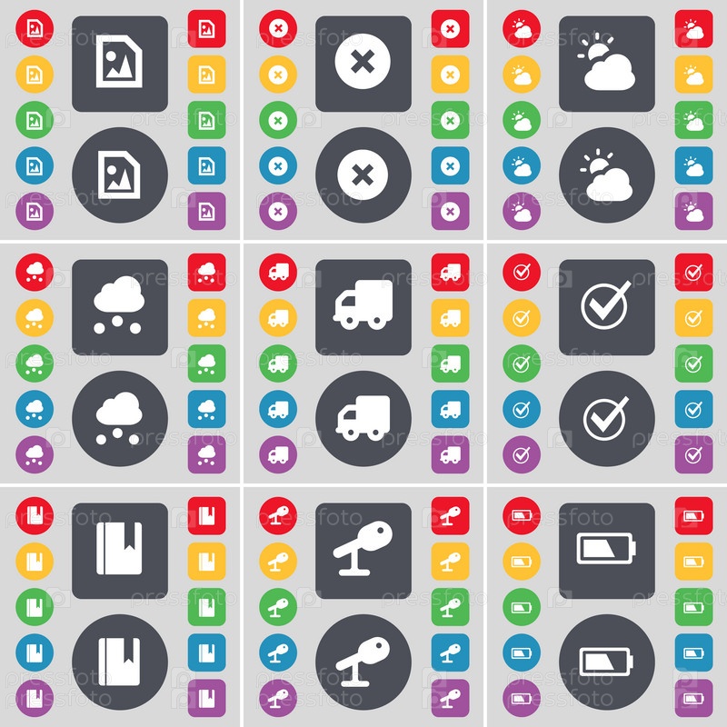 Файл мультимедиа, стоп, погода, облако, грузовик, тик, словарь, микрофон, значок символ батареи. Большой набор плоских, цветные кнопки для вашего дизайна. Вектор