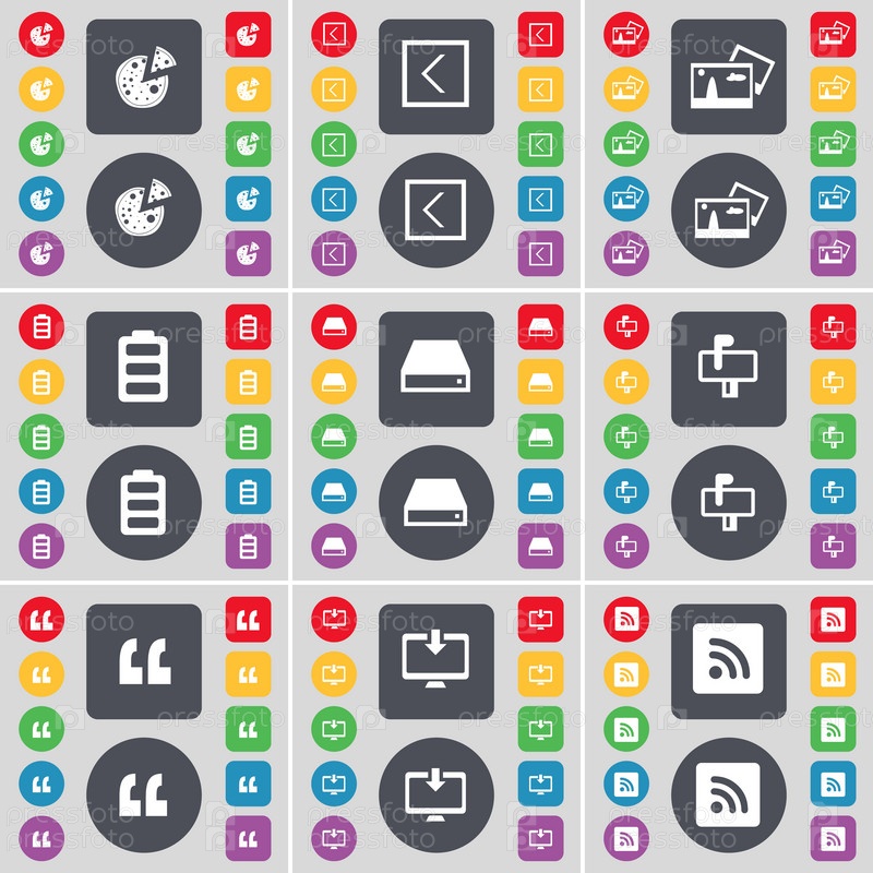Пицца, стрелка влево, фотография, батарея, жесткий диск, почтовый ящик, цитирующий знак, монитор, значок символа RSS. Большой набор плоских цветных кнопок для вашего дизайна