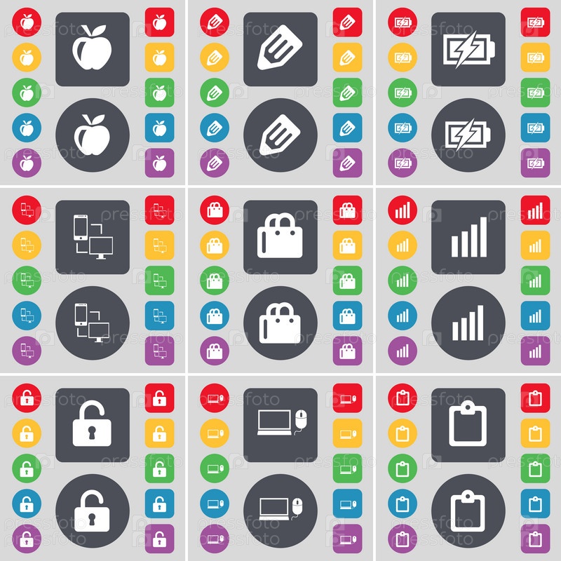 Яблоко, карандаш, зарядные устройства, связи, магазинный мешок, диаграмма, замкновение, ноутбук, обзор значка символа. Большой набор плоских цветных кнопок для вашего дизайна. вектор