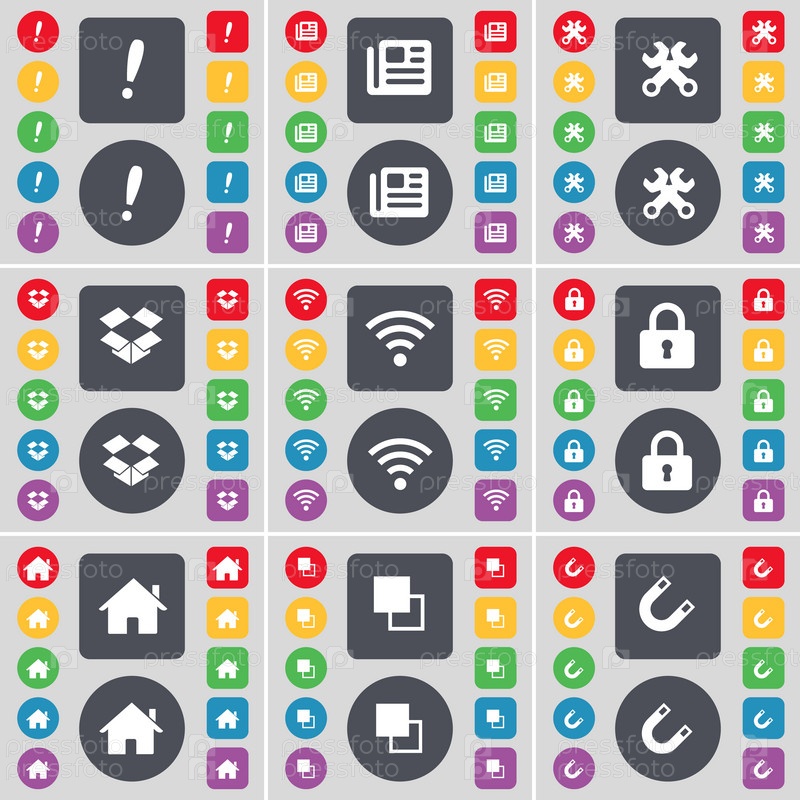 Восклицательный знак, газета, гейковерт, Dropbox, Wi-Fi, замок, дом, копировать, магнитный значок символа.Большой набор плоских цветных кнопок для вашего дизайна.Вектор
