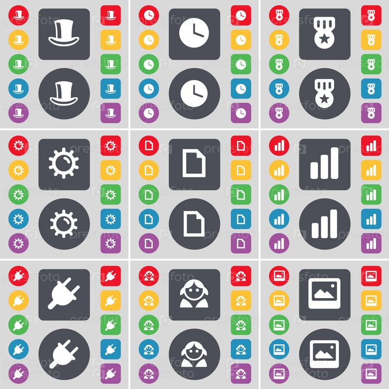 Цилиндр, часы, медали, оборудование, файл, диаграмма, Socket, аватар, окна иконки символа. большой набор плоских цветных кнопок для вашего дизайна. вектор