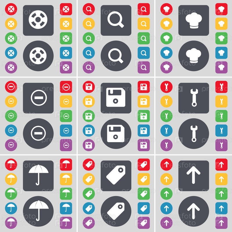 Видеозапись, увеличительное стекло, приготовление шляпу, минус, флоппи, гайковерт, зонтик, тег, стрелка вверх значок символа. Большой набор плоских, цветные кнопки для вашего дизайна. Вектор