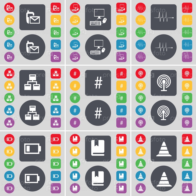 SMS, ПК, пульс, сеть, хэштег, Wi-Fi, батарея, словарь, конусный значок символа. большой набор плоских цветных кнопок для вашего дизайна. вектор