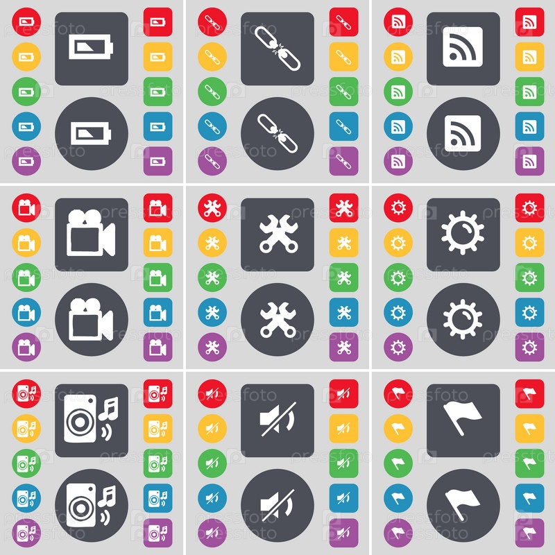 Аккумулятор, ссылки, RSS, пленочная камера, гаечные ключи, Gear, спикер, Mute, флаг и значок символа башни. Большой набор плоских цветных кнопок для вашего дизайна. вектор