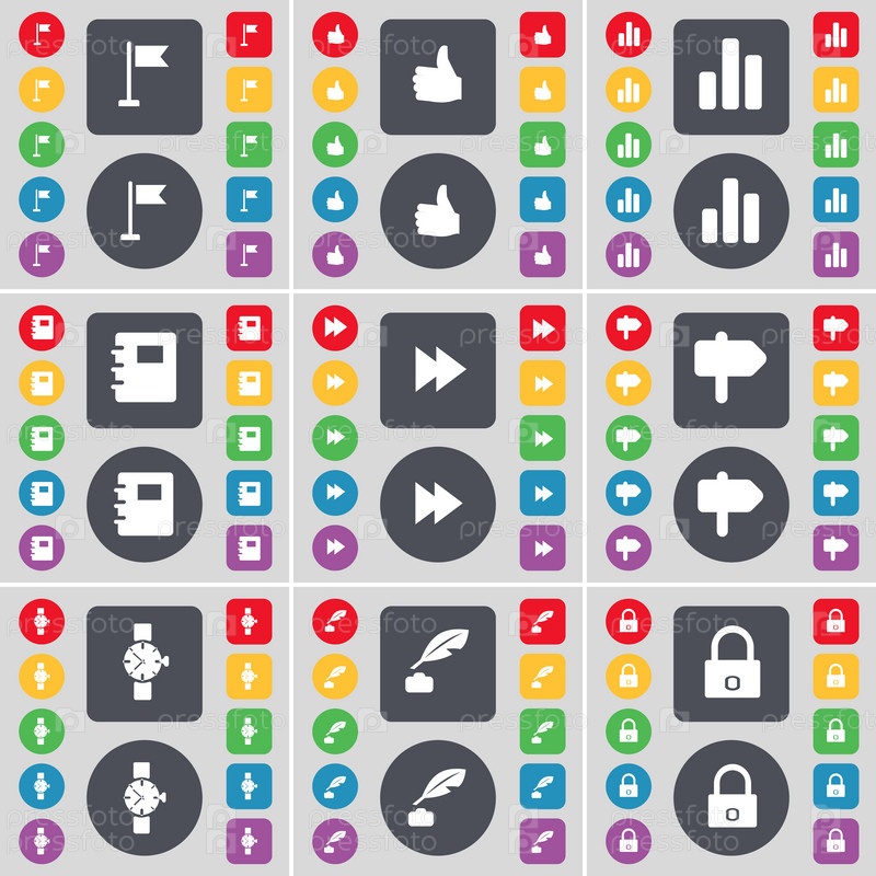 Голфовое отверстие, например диаграмма, ноутбук, Rewind, указатель, наручные часы, чернила, символ икон замка.Большой набор плоских цветных кнопок для вашего дизайна.Вектор