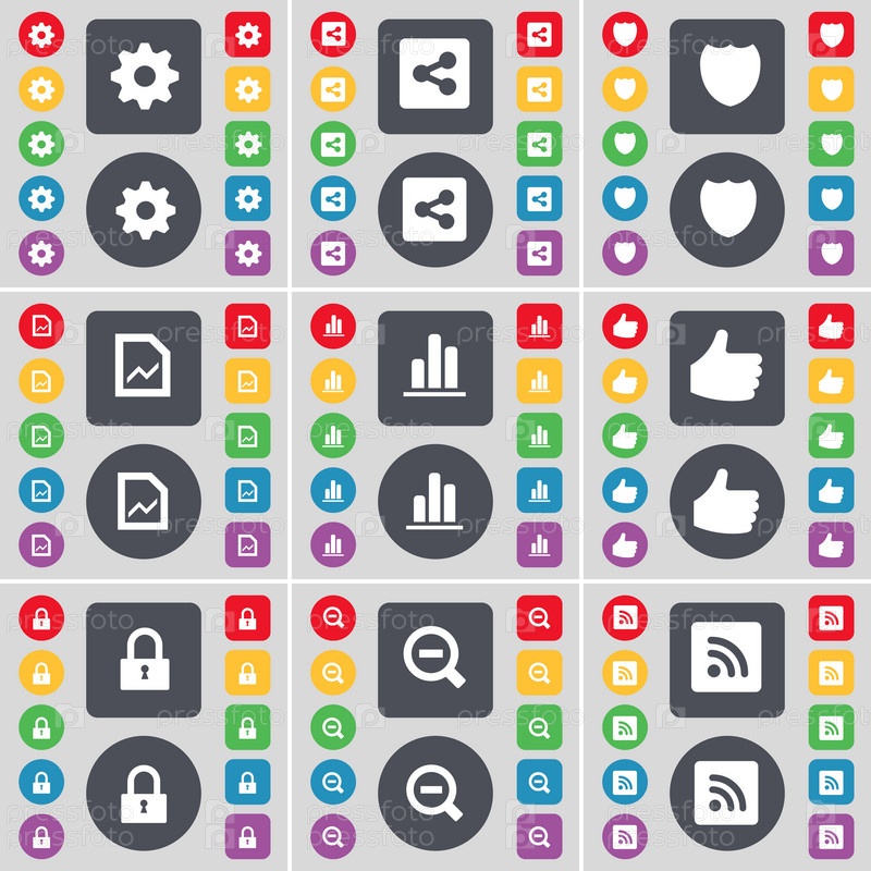 Рычаг, доля, знак, файл графа, диаграмма, как, замок, минус, RSS значок символа. большой набор плоских цветных кнопок для вашего дизайна. вектор