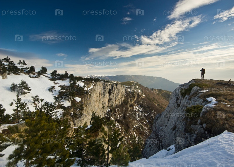 Человек, стоящий на вершине скалы в горах на рассвете