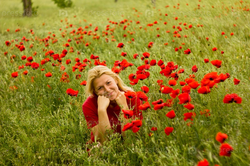 Девушка улыбаясь на Маковом поле