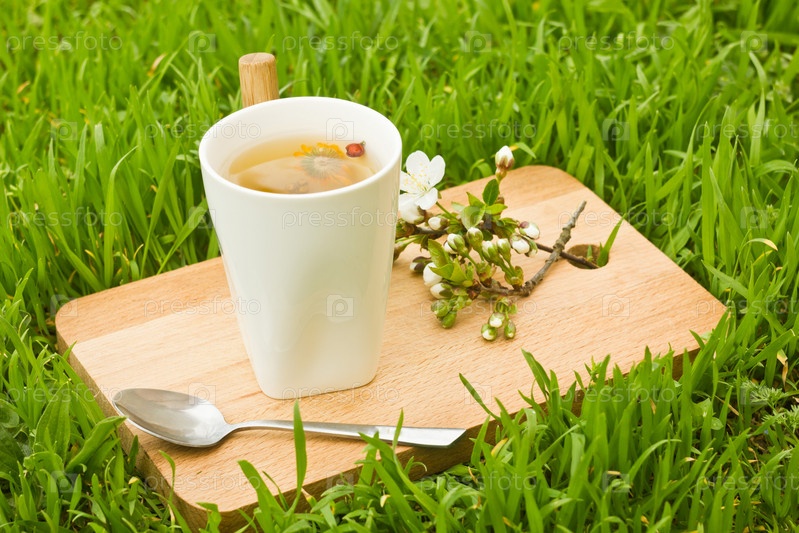 Травяной чай на деревянной доске с трава фон