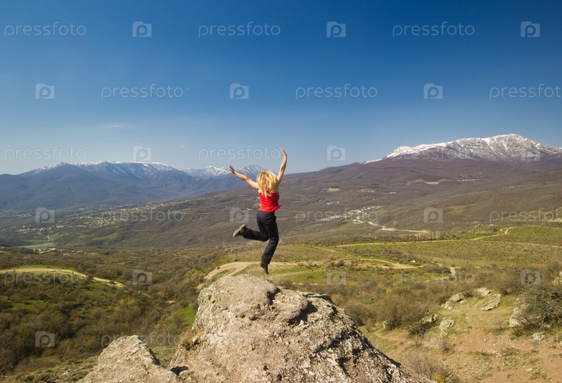 Девочка прыгает с руки вверх в горах против солнца