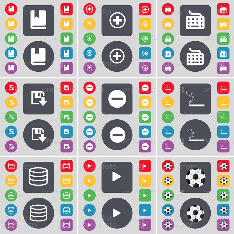 Словарь, плюс, клавиатура, дискеты, минус, сигареты, базы данных, игры, мяч значок символа. Большой набор плоских, цветные кнопки для вашего дизайна. Вектор